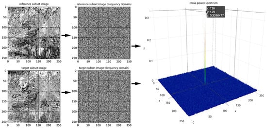 Subset images within the matching window in spatial and frequency domains and the corresponding cross-power spectrum (spatial domain).