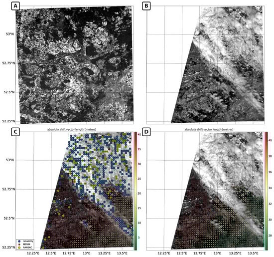 Use case INTER1: (A) Reference image (Landsat-8); (B) target image (Sentinel-2A); (C) calculated tie point grid including false-positives (absolute shift vector length in metres); and (D) calculated tie point grid used for image warping (absolute shift vector length in metres).
