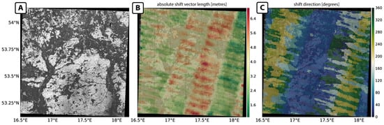 Use case INTRA1. (A) Target image (Sentinel-2A, band 8A); (B) calculated tie point grid (absolute shift vector length in metres); and (C) calculated tie point grid (shift direction in degrees from north).