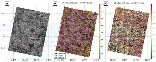 Use case INTRA2: (A) Target image (TerraSAR-X, X-band); (B) calculated tie point grid before correction (absolute shift vector length in metres) including false-positives; and (C) calculated tie point grid after correction (absolute shift vector length in metres) excluding false-positives.