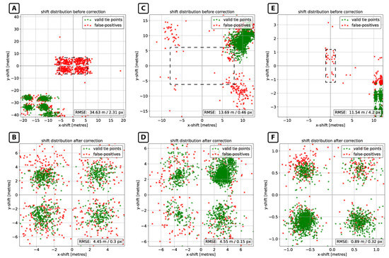 Distribution of detected geometric shifts before and after correction. RMSE in pixel units always refers to the spatial resolution during image matching: (A,B) use case INTER1—Sentinel-2/Landsat-8; (C,D) use case INTER2—RapidEye-5/Landsat-8; and (E,F) use case INTRA2—TerraSAR-X. The dashed boxes in (A–C) indicate the axis limits of (B–F) for easier comparison of geometric shifts before and after correction.