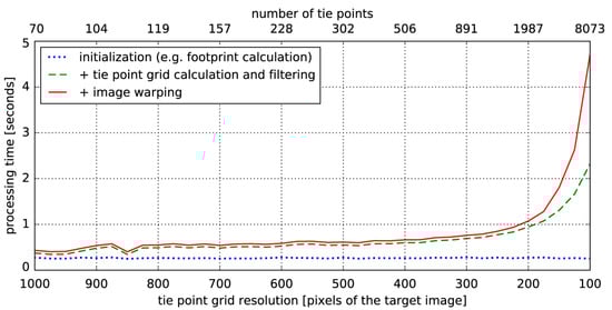 Benchmark results of the proposed co-registration workflow based on use case INTER1 with varying tie point grid resolution.