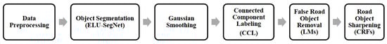 Gaussian smoothing [31] is a 2-D convolution operator that is used to ‘blur’ images and remove unnecessary details and noises by utilizing the Gaussian function. The Gaussian function is used to determine the transformation needed for each pixel, resulting in a more complete extended road objects. We applied the Gaussian function first in the post-processing step in order to expand and prepare objects that are close to each other to be combined into components in the next step (as we shall see in Section 3.4).