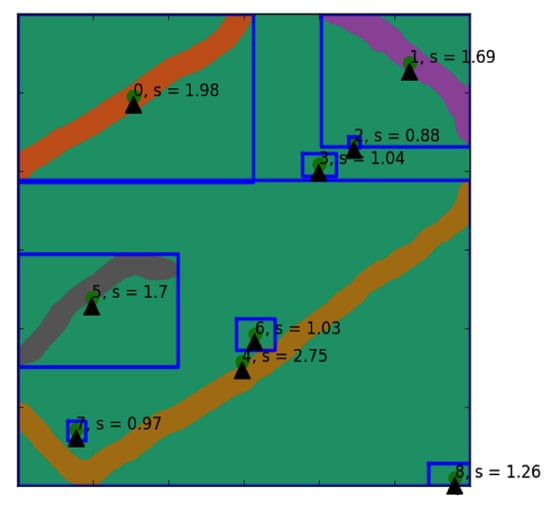 After smoothing and labeling the objects, we compute the shape complexity of the objects through the shape index (as seen in Equation (3)), one of the landscape metrics for measuring arrangement and composition property of spatial objects. The resulting objects along with their shape scores are shown in Figure 3. As seen in Figure 3, the geometrical characteristics of roads were captured and differentiated from other spatial objects in the given image. Other geometry metrics can also be used such as rectangular degree, aspect ratio, etc. More information on other landscape metrics can be found in [32,33].