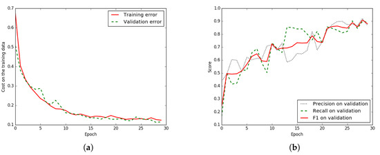 In this sub-section, the experiment was conducted on the Massachusetts aerial corpus. To achieve the highest accuracy, the network must be configured and trained many epochs until all parameters in the network are converged. Figure 6a illustrates that the proposed network has been properly set and trained until it really is converged. Furthermore, Figure 6b shows that the higher number of epochs tends to show a better -score. Thus, the number of chosen epochs based on the validation data is 29 (the best model for this data set).