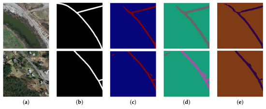 Two sample input and output THEOS satellite images on the Chonburi data set, where rows refer different images. (a) Original input image; (b) Target road map (ground truth); (c) Output of ELU-SegNet; (d) Output of ELU-SegNet-LMs; and (e) Output of ELU-SegNet-LMs-CRFs.