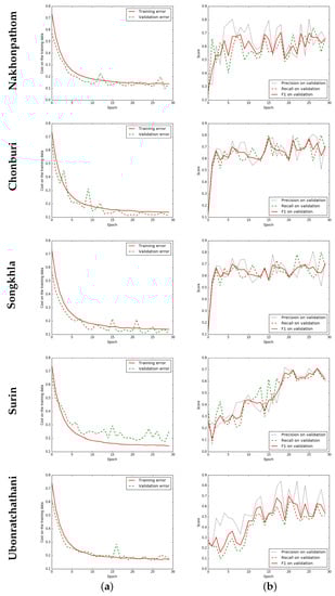 In this sub-section, the experiment was conducted on THEOS satellite images. There are five data sets referring to different provinces: Nakhonpathom, Chonburin, Songkla, Surin, and Ubonratchathani; therefore, there are five learning models. Figure 8 shows that each model is properly set up and trained until it is converged and obtained the best . The best epochs (models) for each province are 25, 15, 30, 21, and 20, respectively.