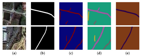 Two sample input and output THEOS satellite images on the Songkhla data set, where rows refer different images. (a) Original input image; (b) Target road map (ground truth); (c) Output of ELU-SegNet; (d) Output of ELU-SegNet-LMs; and (e) Output of ELU-SegNet-LMs-CRFs.