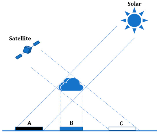 Specifically, for a remote sensing image, according to most existing radiation retrieval approaches [20,21,22,23,24,25,26,27,28,29,30], the criteria used to determine whether a pixel is suitable for a cloudy-sky or clear-sky algorithm mainly depend on the result of cloud detection. While the fact is that both solar and satellite-sensor have certain zenith and azimuth angles, the cloudy pixels shown on a remotely sensed image are only projections of the corresponding cloud at the observing direction, but not the cloud orthographic projections on the ground. The projected and the actual location of the cloud will certainly have a large deviation if the observing and the solar zenith angles are relatively large. As shown in Figure 1, region B is the orthographic projection position of the cloud on the ground, region C is cloud projection on the image (cloud pixels shown in the image), and region A is the cloud shadow on the image. According to the processing manner of currently existing algorithms, region C is considered to be affected by cloud, so the cloudy-sky algorithm is employed. At the same time, A is accordingly deemed as under clear-sky conditions and the clear-sky algorithm is thus adopted. However, in fact, it is region A that is really contaminated by the clouds, not region C, so in existing algorithms, the estimation of radiation in both regions A and C are fairly unbelievable. Strictly speaking, the existing approaches to derive surface cloudy-sky radiation are valid only for the nadir case for both solar and satellite-sensor (both zenith angles equal to 0 for certain cloudy pixels). In other words, the most-used radiation retrieval methods only utilize a typically vertical one-dimension approach, but not a three-dimension consideration, thus the SCSG effect can never be addressed. In particular, the large impact of the solar-cloud-sensor geometry on land surface radiation will be enlarged in polar-orbit satellite data acquired at higher latitudes or in images collected by stationary satellites around sunrise or sunset wherein the solar zenith angle is relatively large. Therefore, to obtain the true spatio-temporal distribution of surface radiation, the significant influence of solar-cloud-sensor geometry should be taken into account and effectively corrected during the retrieval based on remotely sensed data. Note that, except for the surface radiation, all other surface parameters, such as LST and albedo, are also seriously disturbed by clouds. Here, although land surface radiation is selected as a case study, the correction scheme is general and can easily be adopted for other remotely sensed surface variables.