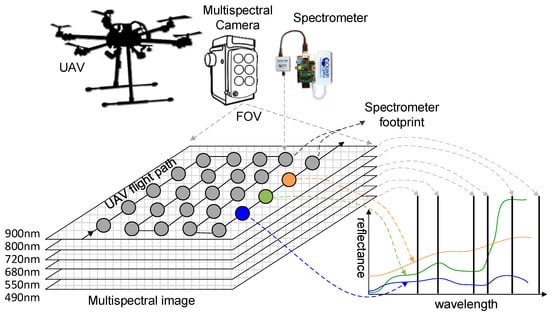 Once data alignment has been optimized, fusion of the two data types is conducted by cross calibrating coincident sample points of full spectrum spectrometer data and multispectral image data, and using that relationship to estimate full spectrum reflectance at all pixels in the multispectral camera images. Many spectra acquired by the spectrometer are selected to build a training dataset of representative ground features (e.g., soil, corn, wheat). A small proportion of the measured spectra can be set aside as independent reference data to assess the accuracy of the estimated hyperspectral imagery. More details about the data fusion methods are explained in Section 2.3.