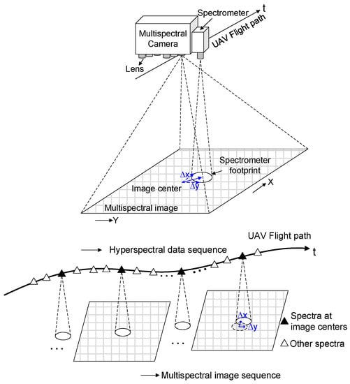 The remote sensing system for the proposed data fusion process includes a multispectral imaging sensor and a spectrometer; for our purposes, they are mounted on a small UAV as shown in Figure 1, but they could be mounted on any in situ or airborne platform. Mounting the two sensors is conducted to visually achieve alignment of their optical axes (e.g., with the spectrometer and camera housings parallel). The multispectral sensor acquires 2D multiple band images from separate cameras, each with a specific bandpass filter, while the spectrometer collects one full spectrum sample per measurement within a near circular footprint determined by the angle of view (optics) and the platform altitude and orientation. The details of our experimental UAV system, settings and camera configuration are further described in Section 3. Given an appropriate frame rate or GPS-controlled camera triggering is used, the multispectral camera images should cover the required area; for most applications a mosaic must be produced from multiple images. The spectrometer samples will cover a set of footprints, each being much larger than the multispectral image pixels, and these footprints may not cover the whole study area, due to the spectrometer data rate and UAV velocity. The goal is to associate individual reflectance measurements from the 1D spectrometer, with pixels in the 2D multispectral images that fall within the field of view of the spectrometer. The approach taken in this study was to develop post-acquisition processing methods to optimize the alignment of the data from the two sensors, by evaluating their timing and spatial correlations. Details are provided in Section 2.2.