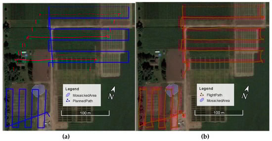 In the application and evaluation of the data fusion approach, UAV flights were conducted over an experimental farm on 21 July 2016, near London Ontario, Canada. A hexa-copter (DJI Spreading Wings S800) was used with take-off weight (including sensors) of 6 kg. For the lightweight sensors used in this study (Section 3.2), an even smaller and lower cost UAV could be used. The major ground cover types were crops, bare soil, and gravel roads, with smaller extents of other short vegetation, trees and buildings. The planned and actual UAV flight paths are shown in Figure 3a,b, where two flights were conducted over a tomato field (Site 1), and a larger field of corn and soybean (Site 2), respectively. The flight speed was 5 m/s, and the flight altitude was 30 m and 50 m above ground for Site 1 for Site 2, respectively. The sky was clear during the flights with negligible sun illumination variation.