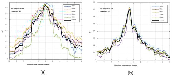 Linear correlation between sample pairs of multispectral camera intensity and spectrometer reflectance at Site 1 (a) and Site 2 (b). Each subfigure includes five curves representing the five multispectral bands, plus a thicker line representing the average R2. Each curve is the correlation for the given band at 0.2 s interval time offsets over the ±10 s range. The maximum average R2 and its corresponding time offset are given in the upper left of each graph.