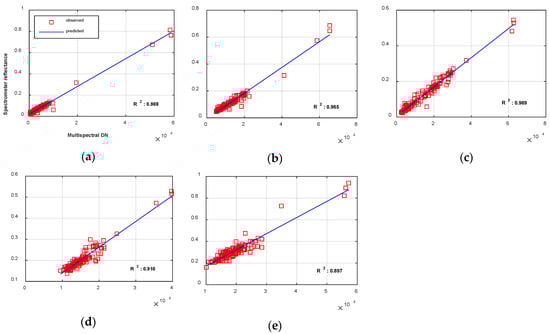 Following the above steps, the acquired signals from the multispectral camera and spectrometer are comparable spectrally and spatially. The correlation (determination coefficient, R2) between the two data sets is then calculated to determine the best alignment; i.e., the alignment for which the R2 between the datasets is maximized (Equation (5)).