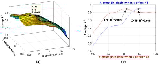 The profile of R2 distribution along the spatial domain at the ideal time offset (−0.2 s) in Site 1, is shown in Figure 6a, and the profiles over the X and Y directions are given in Figure 6b. A peak R2 value that was closest to the multispectral image center was selected; the resulting offset was Δx = +45, Δy = +5 pixels with R2 = 0.946 as shown in Figure 6a.