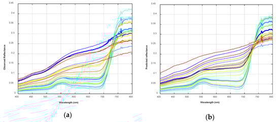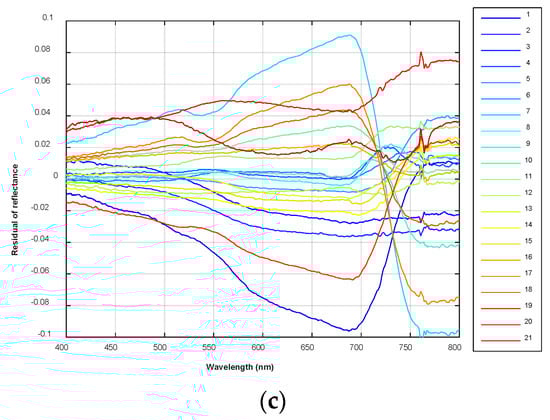 To predict full spectra at locations with only multispectral data, the PCA modelling method was implemented according to Equations (6) and (7), where m = 5 multispectral camera bands and n = 840 spectrometer bands within the wavelength range of 400 nm to 800 nm. The l = 128 samples of spectrometer and multispectral camera data taken from the optimal image location as determined in the previous section, were used as reference data in Equation (7). For validation purposes, 21 random samples of the spectrometer reflectance measurements were set aside, to be compared with predicted spectra. Thus k = 107 training data samples were used in the PCA imputation. Following experimentation with similar PCA methods [27,28,29], trimmed scores regression, based on the PCA method, was adopted in this study, because of its balance between prediction quality and robustness with data structure complexity and computation time [29]. The first three principal components were used in this procedure. According to suggested default values given in [28], the maximum number of iterations was set at 10, and the convergence tolerance was set at 0.0001. The 21 validation (observed) spectra, the corresponding predicted spectra, and the difference between them are shown in Figure 7a–c, respectively.