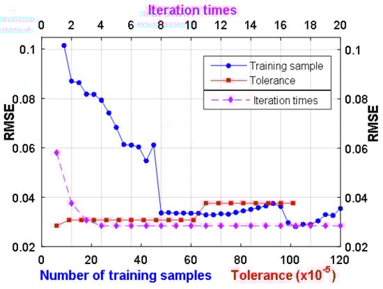 In addition, to test the impact of data fusion method parameters on accuracy, using Site 1 data, the data fusion step was run many times with each parameter changed as a sequence, and the corresponding RMSE of estimated hyperspectral spectra was computed. Specifically, the two PCA-based data fusion parameters were tested: iteration times (5–120, default 10), convergence tolerance (10−5–10−3, default 10−4), and the training sample number was also changed from 10, to 120. Figure 8 shows the impact of variations in converge tolerance on RMSE to be minor, while for RMSE was stable for numbers of iterations above 20. The number of training samples significantly affected RMSE; RMSE dropped after about 50 training samples among the 128 samples tested with the Site 1 data.