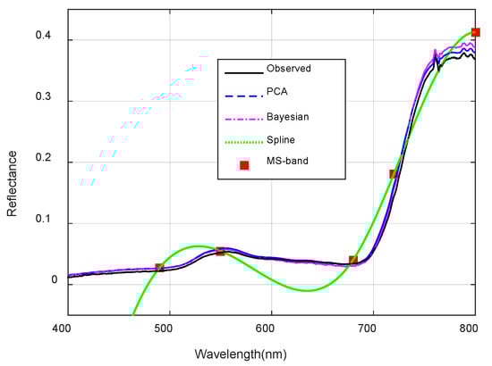 An example of the three types of data fusion compared with an observed spectrum over a crop sample at Site 1. The “PCA” is the “PCA_TSR” approach, “trimmed scores regression” defined in Section 3.2; the “Bayesian” is the “Bayesian_Gibbs” (Bayesian method with Gibbs sampling [27]) as defined in Section 3.2. “MS bands” are the spline interpolated reflectances derived directly from the multispectral (MS) camera data.