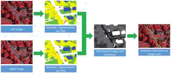 Figure 1. Firstly, we manually label the remote sensing image data into several most cover classes as the training data, which is then used to train our proposed fully convolutional network for semantic segmentation. Secondly, the overlap regions of the left and right images are classified via the trained network independently, and we can obtain the probabilities of each pixel belonging to each of the specified classes. Finally, we define the energy costs based on those classification probabilities, and find the optimal seamlines via graph cuts. In addition, the detected seamlines are evaluated quantitatively based on the defined quality measurements. The main contributions of our proposed approach are summarized as follows: