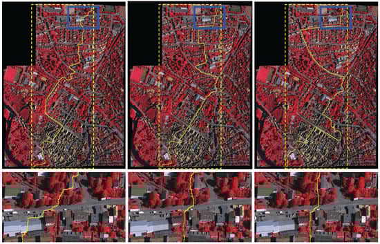 Figure 12b–d, especially in the enlarged detailed regions. However, the seamlines detected by our proposed approach successfully avoid crossing those buildings and choose to cross the nearby roads, as shown in