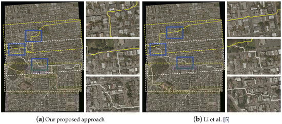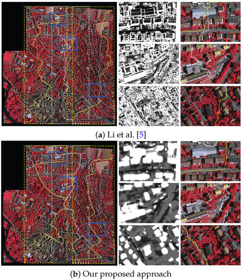5]. For example, in three local regions, the seamlines detected by our proposed approach all avoid crossing the buildings, and choose to pass through nearby roads, but the seamlines detected by Li et al. [