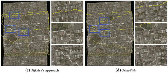 OrthoVista cannot avoid crossing obvious objects in some cases. In total, those seamlines cross 21 buildings and 17 cars, but the seamlines detected by our approach only cross two cars. We also observed that the seamlines generated by Dijkstra’s approach can avoid crossing major obvious objects as our approach does. However, they also cross two buildings and two cars.