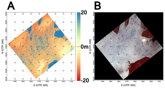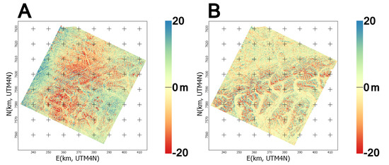 In this scenario, an extra processing step is necessary to mask the area of clear-cut that cannot be filtered using pre-existing data. First, a dDEM needs to be produced to create a mask that can then be applied before removing the along-track jitter and computing the final dDEM. The mask is created by a thresholding of the uncorrected dDEM (in this case, the threshold is set at m) and then a morphological opening and dilating (5 × 5 square structuring element for both) of the result to obtain a binary mask of the clear-cut areas to be filtered out for the along-track correction. A similar approach is then followed to create the mask identifying clear-cut areas from the final dDEM. The final mask is shown in Figure 16B.