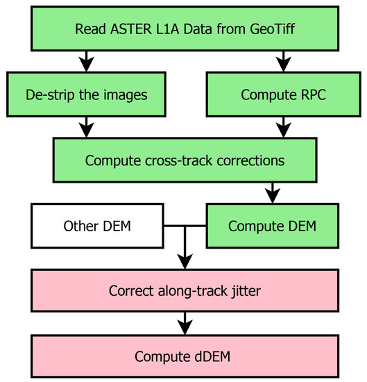 Most of our workflow is implemented in the free open source MicMac photogrammetric library (developed at the French National Institute of Geographic and Forest Information (IGN) [18]), except for the post-processing steps described in Section 2.5 (correction of the DEM by analysis of dDEM), which is currently implemented as a MATLAB script. Hence, we can offer a ready-to-use software package to produce DEMs and orthoimages from Level 1A ASTER products.