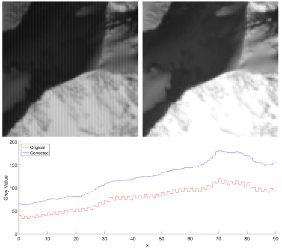 Extract of the VNIR Band 3N of an ASTER scene. (Top left) Original image. (Top right) After destriping. (Bottom) Mean profile across the x axis for both extracts.