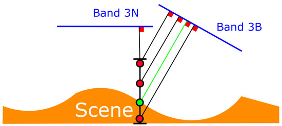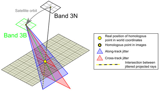 The jitter of the satellite can be divided into three components: the cross-track (roll), the along-track (pitch) and the rotation along the nadir axis (yaw). Since the two images of each set are taken in the same orbit, the epipolar lines are almost parallel to the along track direction ( × degrees away from the y axis of the images). This results in a nearly perfect separation of the cross- and along-track components of jitter in image space, while the yaw component can be seen as a very small perturbation. In Figure 6, we can see that the perspective ray from the nadir image can only cross the one from the back-looking image if the cross-track attitude of the satellite is known (i.e., the ray does not intersect with the rest of the red triangle).