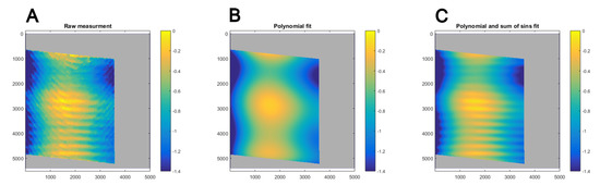 First, the data are filtered to remove areas that returned low bi-dimensional correlation (and hence, are dubious). The rejection mask is dilated by a 21 pixel-wide square structuring element to ensure that lower correlation regions are not affecting our jitter model. This latter step simply improves the robustness of the model while reducing the processing time required. The large-scale error pattern is solved using a 7th degree polynomial in both the x and y directions (see Figure 7B and Equation (7)). The choice of the 7th degree polynomial compared to a more gradual increase of the polynomial degrees, stopping when the residual value stops evolving, is motivated by both an improved computational speed and by the extensive testing showing that this value was generally the best.