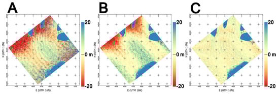 DEM product over the sea ice scene AST_L1A_00307072008194108_02012009125352.hdf. (A) Using only the metadata; (B) After correcting the cross-track parallax; (C) After fitting cross- and along-track corrections using a flat DEM over the sea ice area.