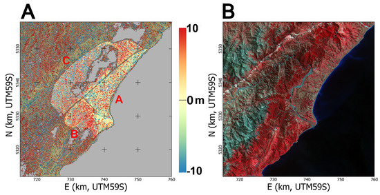 (A) Post seismic vertical displacement. The three highlighted Zones A, B and C are separated by the Kekerengu and Papatea faults. Grey areas are where the elevation change was over 30 m or not computed because of the sea or the presence of clouds (mostly in the 2016 scene); (B) Orthoimage from the 2011 scene.