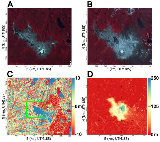 For this scenario, we differenced the MMASTER DEMs from two scenes 10 years apart (dataset reference in Table 4), the first one in 2003 (i.e., before the 2011 eruption) and the second in 2013 (i.e., after the end of the 2011 eruption). The comparison between both images (Figure 15A,B) clearly highlights (1) the dark rhyolitic lava flow NNW of the summit Puyehue caldera and (2) the distribution of thick pyroclastic deposits, in light grey. The 2013 image also displays a dark aureole surrounding the main volcanic edifice to the north, east and south. In the 2003 image, this area corresponds to vegetation; therefore, we interpret this dark aureole as regions where the forest was killed by the ash deposited during the main eruption.