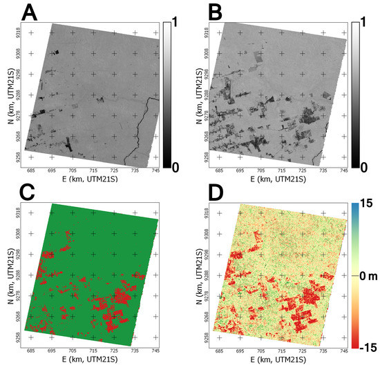 Masking could also be done by identifying the clear-cut areas in the NDVI product that can be derived from the orthorectified data (see Figure 16A,C, dark is low NDVI indicating no vegetation, while light is high NDVI indicating the presence of vegetation), since we can expect that the NDVI value would have dropped significantly (see for instance, the method discussed in [33]). However, in the case of re-exploited clear-cut areas (by soybean plantations, for instance), the NDVI-based method would fail.