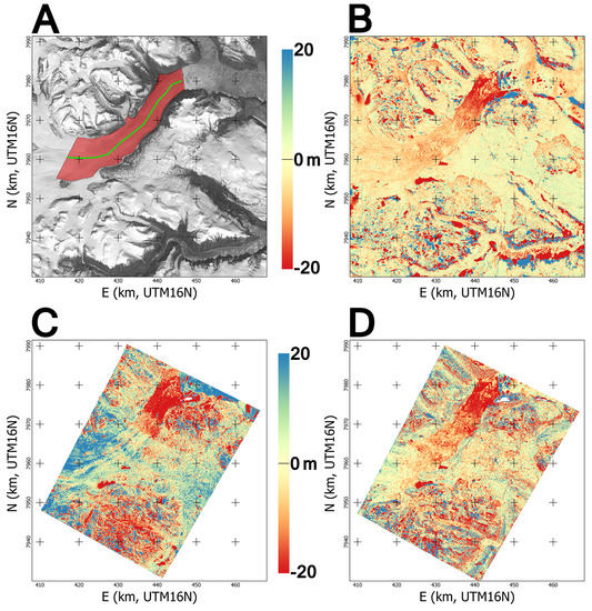 (A) Centerline (green) and area (red) considered for the quantitative analysis, overlaying the SPIRIT 2014 orthoimage. Others: Measured elevation change from co-registered 2007 and 2014 DEMs ((B) SPIRIT DEMs; (C) AST14DMO DEMs; (D) MMASTER DEMs).