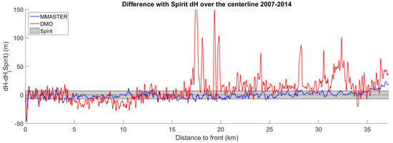 Difference along the centerline (shown in Figure 17A) between the 2007–2014 elevation change from the SPIRIT data (set as the reference data and thus zero; the error bar shown in grey; see Figure 17B) and the elevation change from our product (MMASTER, see Figure 17D) and the DMO product (see Figure 17C).
