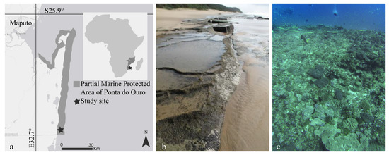 The study area is located in the Partial Marine Reserve of Ponta do Ouro, Mozambique (Figure 1a) and is part of the Isimangaliso Wetland Park, which protects the southernmost tropical coral reefs of the African continent [46]. The coral reef system is dominated by non-accretive corals running parallel to the coastline at 1–2 km from the shore [47,48]. Outcrops are present (Figure 1b,c) and originate from fossilization of Late Pleistocene beaches and dunes [49] that form very flat structures [50]. The area is characterized by high levels of endemic species [51,52,53] with the coral cover being dominated by soft corals that are tolerant to strong wave energy and sediment resuspension [54,55,56,57].