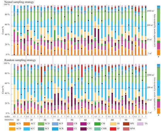 The effect of scale, quadrant density and sampling strategy on cover estimation is summarized in Figure 5. Sampling scales coarser than 5 m × 5 m provide similar cover estimates to those obtained for the overall surveyed area, with the finest scale (0.5 m × 0.5 m) failing to accurately represent cover estimates. This pattern is more noticeable for random sampling strategies than for nested strategies. Regarding the quadrat density applied, no particular patterns can be observed as the number of quadrats used in the survey is increased. However, sampling designs where the combined area surveyed by the quadrats contains in excess of 100 m2 of benthic organisms closely resembles the cover distributions observed within the whole surveyed area.