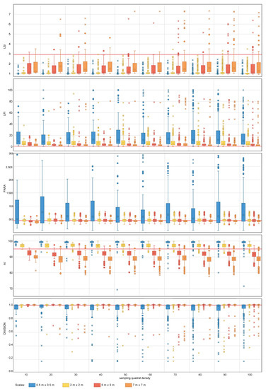 Area-density-edge, shape, contagion and interspersion metric values obtained for the nested sampling strategy for the range of scales and quadrat densities considered. The red horizontal line indicates the metric value obtained on the total area mapped. LSI, LPI, PARA, AI and DIVISION stand for Landscape Shape Index, Largest Patch Index, Perimeter Area Ration Mean, Aggregation Index and Division Index, respectively. The boxplots show the first, second (median), third and fourth quartiles. Circles and crosses indicate outliers and extreme values, respectively.
