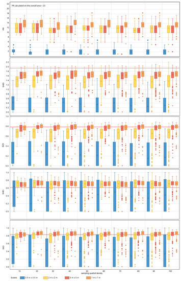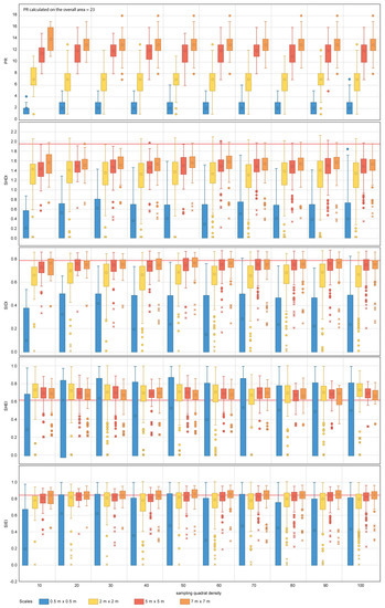 Diversity metric values obtained for the nested sampling strategy for the range of scales and quadrat densities considered. The red horizontal line indicates the metric value obtained for the total area mapped. PR, SHDI, SIDI, SHEI and SIEI stand for Patch Richness, Shannon’s Diversity Index, Simpson’s Diversity index, Shannon’s Evenness Index and Simpson’s Evenness Index, respectively. The boxplots show the first, second (median), third and fourth quartiles. Circles and crosses indicate outliers and extreme values, respectively.