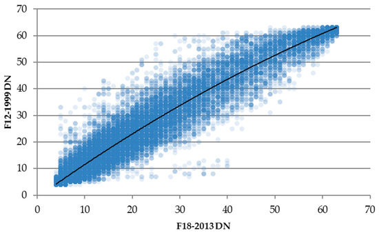 where Xi,0 is the DN of the ith grid cell in the baseline image, Xi,j is the DN of the ith grid cell in satellite-year image j, and the parameters C0, C1 and C2 are the intercept, linear, and quadratic coefficients, respectively. For all images, DNs values less than 2 were excluded in keeping with the author’s method [7]. Figure 1 shows an example regression scattergram for satellite-year F18-2013 versus F12-1999 for Sicily. Regression coefficients generated by the model were then used to adjust the DN values observed for Africa. For each year, a set of calibrated values were computed using Equation (2):