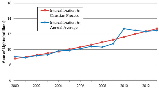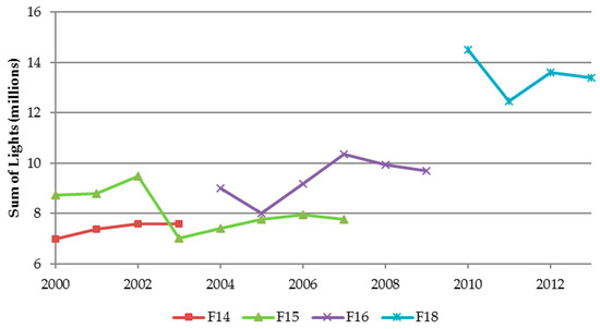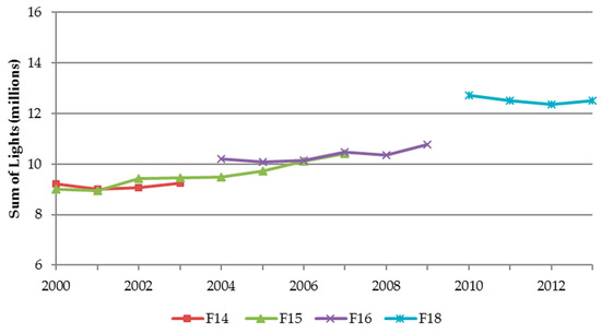 To determine relative success of the intercalibration method, the ‘sum-of-lights’ index (SOL) [7] was calculated for each satellite year. The SOL is simply the sum of the predicted DNs for an NTL image within a region of interest. Once calculated by region, it is plotted as a time series. Success is indicated by a relative convergence of SOL values in years where two satellite products are available, and a relatively continuous growth trend across the time series (Figure 2 and Figure 3).