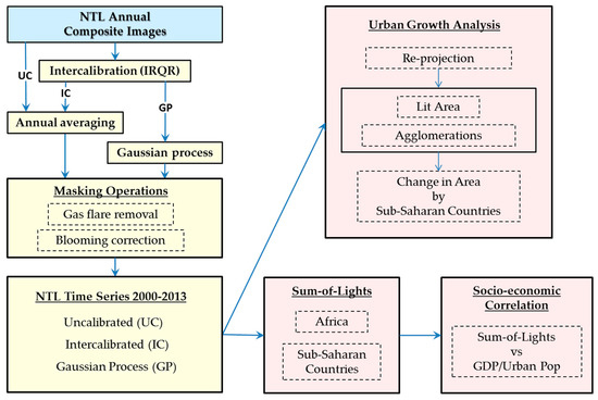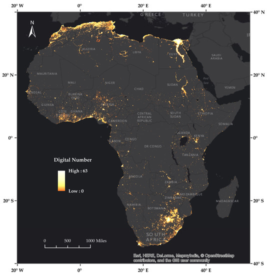 Figure 4 provides a flow chart outlining the work flow for NTL intercalibration, image processing procedures, and validation and analysis. Figure 5 provides an enhanced view of the intercalibrated 2013 nighttime lights image for continental Africa.