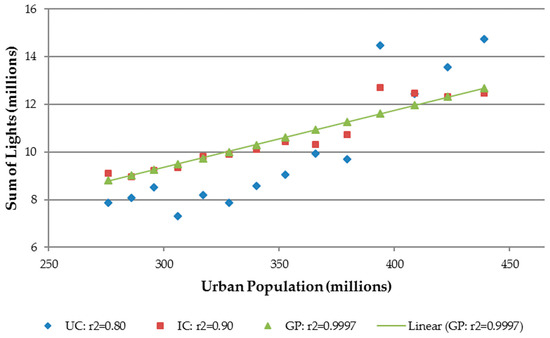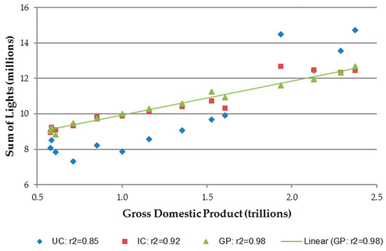 In terms of the relationships between the NTL layers (UC, IC and GP) and GDP and urban population, the UC layer showed the least correlation, while IC and GP case adjustments each incrementally increased the strength of the relationship. The regression results and root-mean-squared error (RMSE) values for continental Africa are listed in Table 4. The coefficients of determination indicate that the SOLs in the GP case have a stronger linear relationship with GDP than those from the IC case. Thus, when Gaussian process smoothing was applied, R2 increased from 0.92 to 0.98 and from 0.90 to 0.9997 for GDP and urban population, respectively. Corresponding RMSE values also decreased dramatically. The high R2 and relatively low RMSE value for the Gaussian process SOL vs. urban population clearly indicates the advantage of this enhanced intercalibration method. Figure 7 and Figure 8 graphically illustrate these improvements.