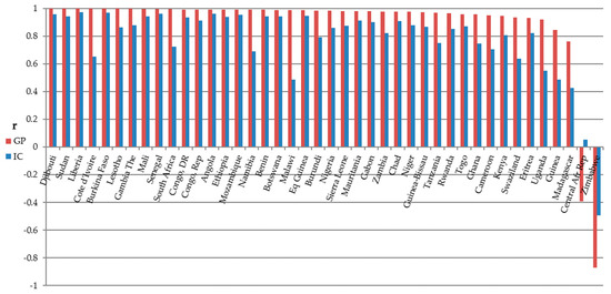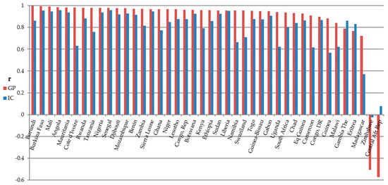 Correlation coefficient by sub-Saharan country SOL vs. GDP. Columns are sorted by correlation coefficient values for GP test case in decreasing order.