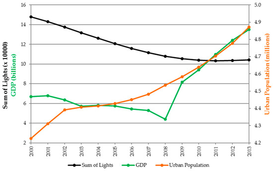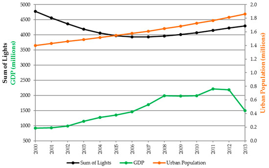 Among the national statistics there were two countries with notably poor negative correlations to both GDP and UP: Zimbabwe and the Central African Republic. Notable is Zimbabwe’s unusual patterns with the SOL decreasing from 2000 through 2011 when it begins to recover. This pattern coincides with a disputed presidential and parliamentary election in 2008 preceded by periods of political unrest. The GDP trended slightly downward during the lead up to the election and then rose sharply thereafter. However, UP rose steadily from 2000 to 2013, even while SOL was decreasing. The Central African Republic also displays an unusual pattern, with relatively low SOL values, an urban population that rises steadily, and GDP that rises but drops abruptly in 2013 in response to a coup d’état. In general, anomalies such as these can be traced to the effects of insurgent warfare, political unrest, and humanitarian crises on nighttime lighting. Bennett and Smith [39] studied socioeconomic changes that caused reductions in NTL in post-Soviet Russia and war-torn Syria, while Li et al. [40] observed similar reductions as a result of the Islamic State of Iraq and Syria (ISIS) insurgency in Northern Iraq. Humanitarian crises often come in the form of drought, famine, earthquakes, and tropical storms. Gillespie et al. [41] examined the effects of tsunami damage in Sumatra (2004–2008) using NTL imagery. Several authors have suggested NTL based metrics for monitoring at risk populations. For instance, Coscieme et al. [42] propose an NTL based index of regional disparity and Li et al. [43] similarly suggest a nighttime light variation index (NLVI) to predict the risk of armed conflicts. All these insights underscore the potential for well calibrated NTL data as a tool for monitoring the regional effects and outcomes of such events.