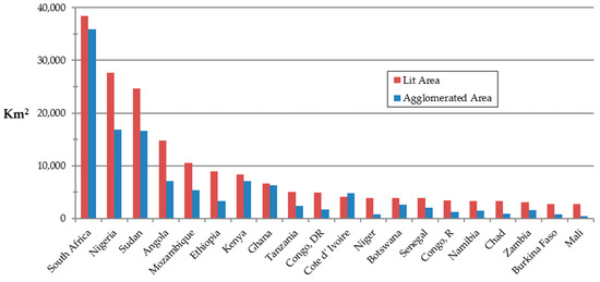 Sub-Saharan countries with significant growth in lit and agglomerated area (>2500 km2 lit), 2000–2013. Columns are sorted by lit area growth in descending order.