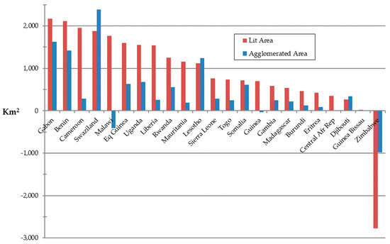 Most sub-Saharan countries exhibited substantially greater growth in lit area than agglomerated lit area. Exceptions included Cote d’Ivoire, Swaziland, Lesotho, and Djibouti which all showed greater growth in agglomerated area. In Cote d’Ivoire, this may be due the effects of civil wars occurring in 2002 and 2011, with increased agglomerated area resulting from migration away from centers of conflict to urban areas. In the case of Swaziland and Lesotho, this is likely related to their proximity to South Africa which has the highest growth rates. In both cases, lit area growth was concentrated along borders with South Africa and internal major roadways. Thus, merging of smaller, patchy urban areas caused a relatively high increase in agglomerated area. In the case of Djibouti, most growth in lit area occurred in the city of Djibouti causing it to surpass the 250 km2 threshold.