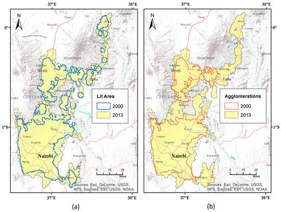 Example of lit area growth (a) versus agglomerated area growth (b) in the Nairobi metropolitan area.